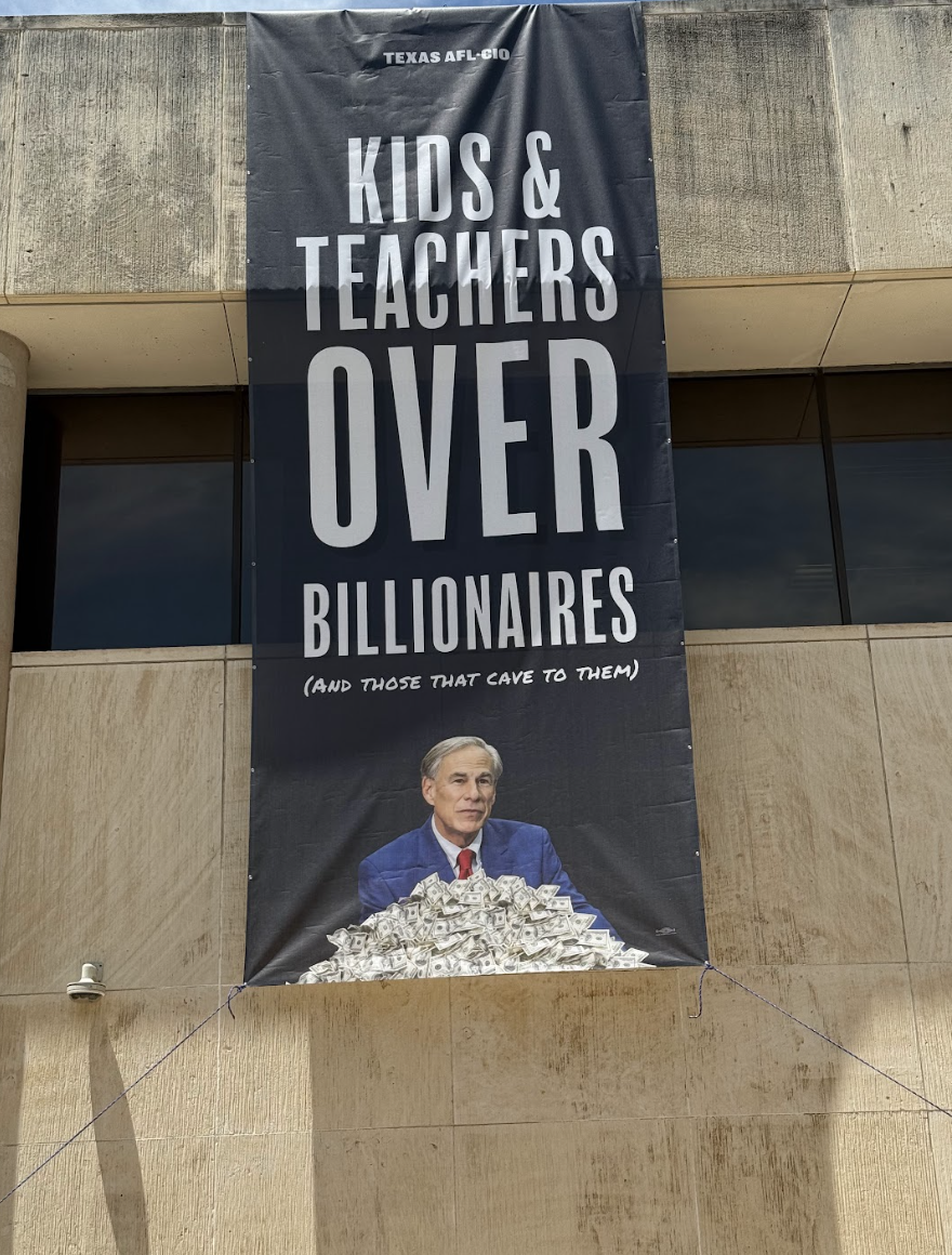 Across from the Governor’s mansions, organizers from the Texas AFL-CIO and the American Federation of Teachers unfurled a banner with a clear message: “Kids and Teachers over Billionaires.” The banner showed Abbott in front of a pile of money.
