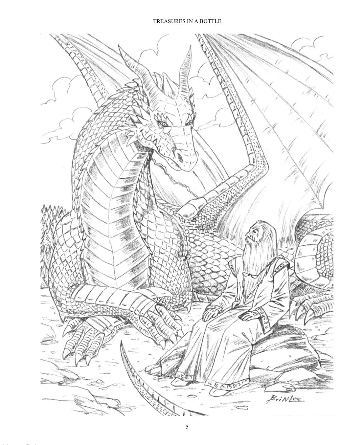 In Treasures in a Bottle, Merlin and Drius gather up representatives of as many magical creatures as they can. Brinlee shows these in loving detail, from the intricate scales of dragons to the homely grins of giants. All agree that mankind is beginning to forget them. While this is preferable to being hunted and killed as they were for generations, it leads to a widespread loss of magic in the world. Merlin, as the bridge between humanity and wonder, sets out to preserve the magical world.