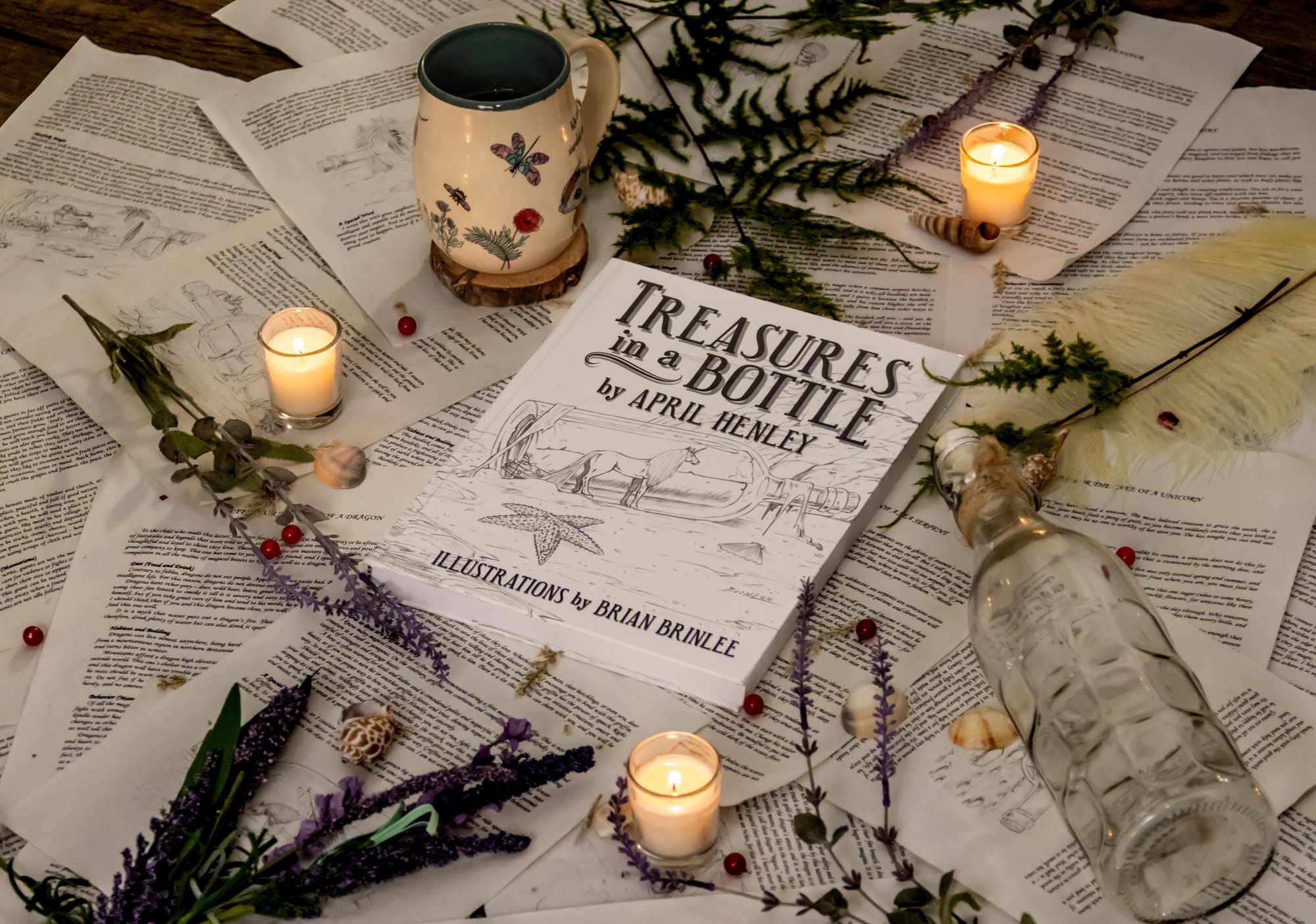 Treasures in a Bottle was first published in 2023. Originally, Henley was interested in just having the book illustrated in full color by artist Brian Brinlee, but she fell in love with the pencil drawings he did of the various magical creatures in the novel. An idea was born.