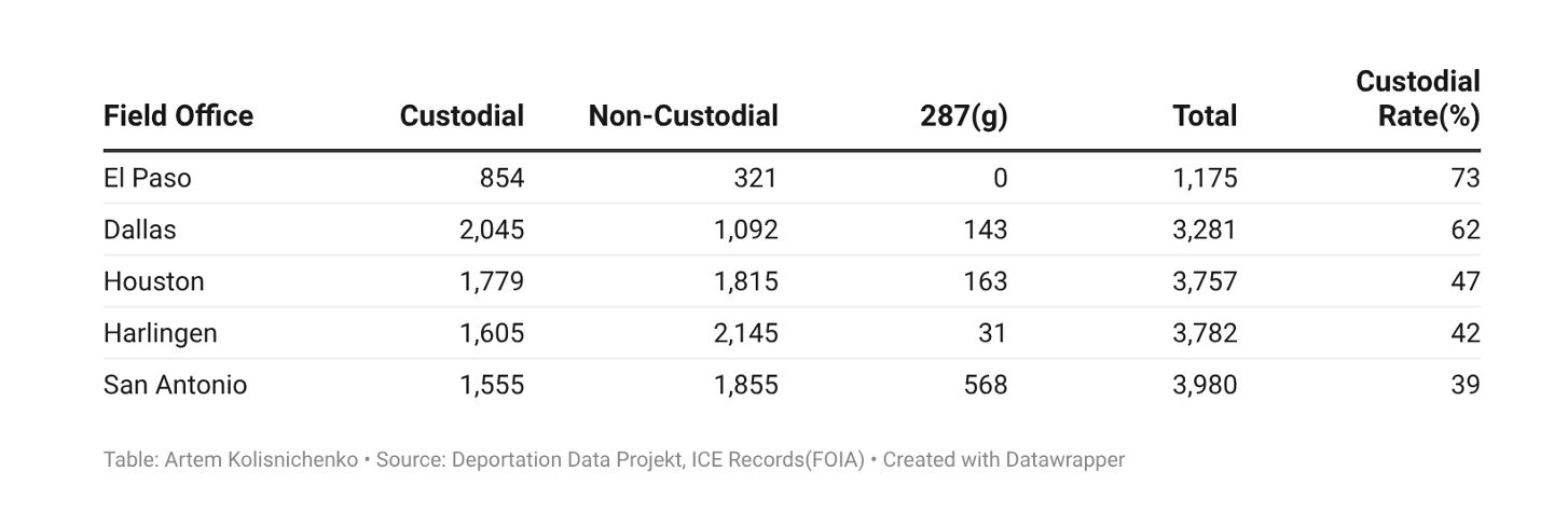 Even with that lid on local disclosure, the early picture is thin. As of Q1 2026, many participating counties had not completed training and had no arrests or bookings under their 287(g) agreements. ICE recorded 905 arrests across all Areas of Responsibility in Texas. San Antonio’s AOR accounted for 568 of those. Houston and Dallas AORs, which include many counties, remained at low levels, in part because the largest jurisdictions, Harris County and Dallas County continued to resist full cooperation.